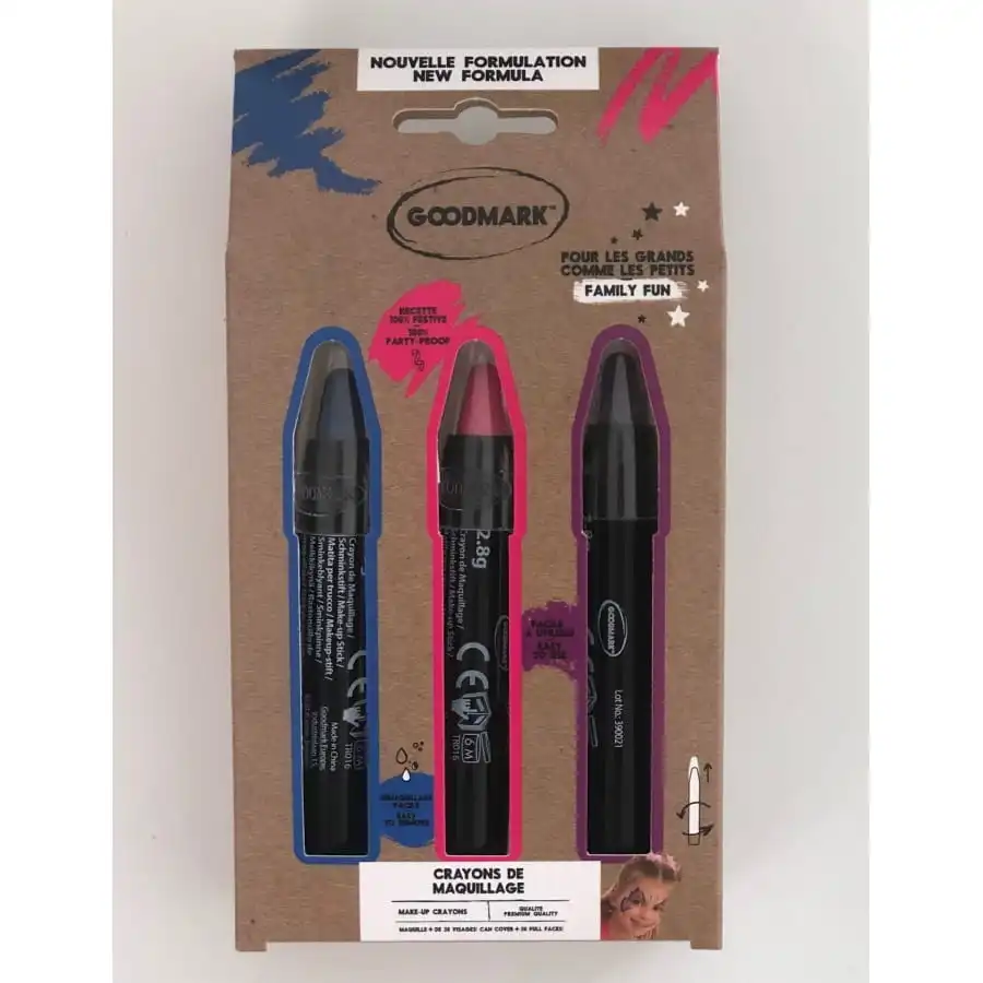 Les 3 crayons de maquillage violet, bleu et rose sont la solution rêvée pour des changer de visage à l’approche du Carnaval ou de Halloween.