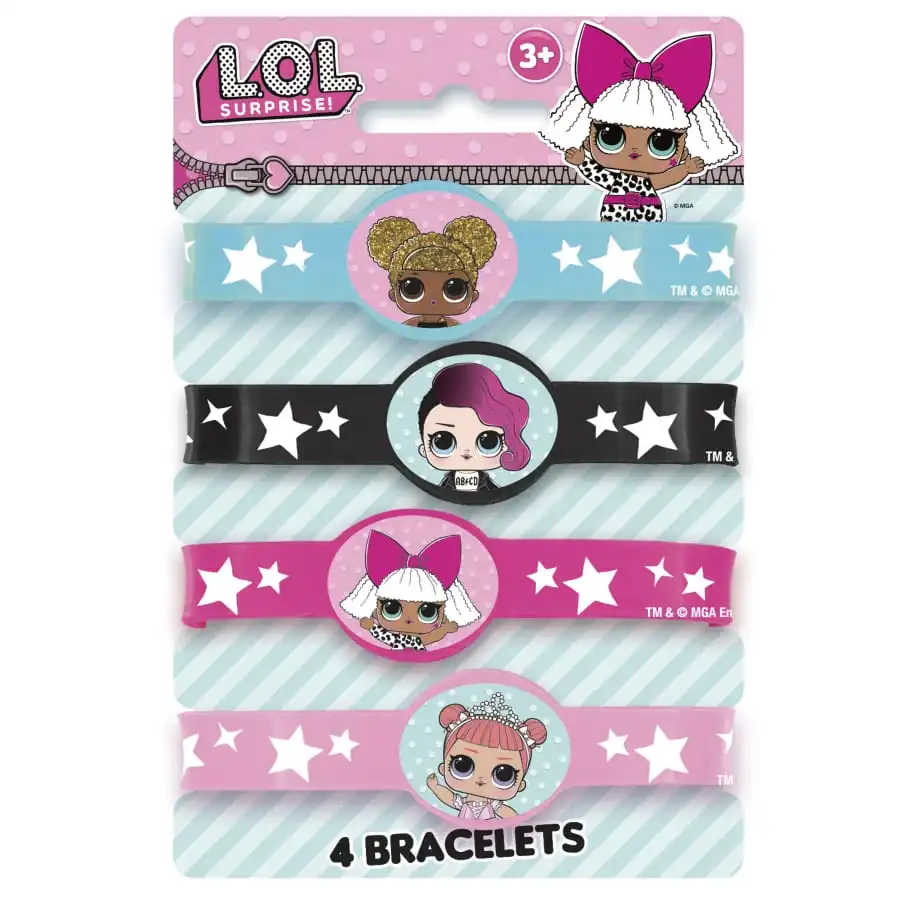 4 bracelets Ă©lastiques ornĂ©s de l’image d’une des poupĂ©es de LOL Surprise et d’Ă©toiles blanches.