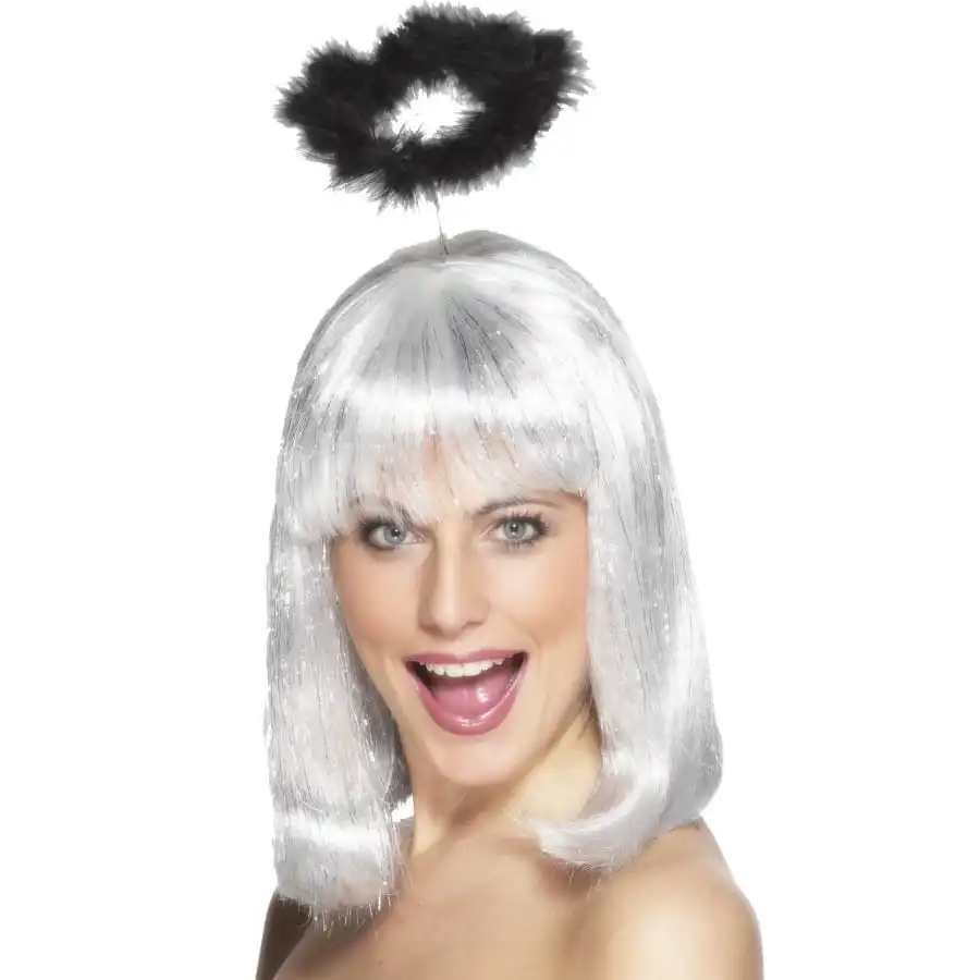 Auréole d’ange noire avec marabout pour femme. Le serre tête se fondra dans vos cheveux et donnera l’impression que l’auréole est en lévitation au dessus de votre tête, accessoire idée pour compléter un déguisement d’anche déchu pour Halloween.