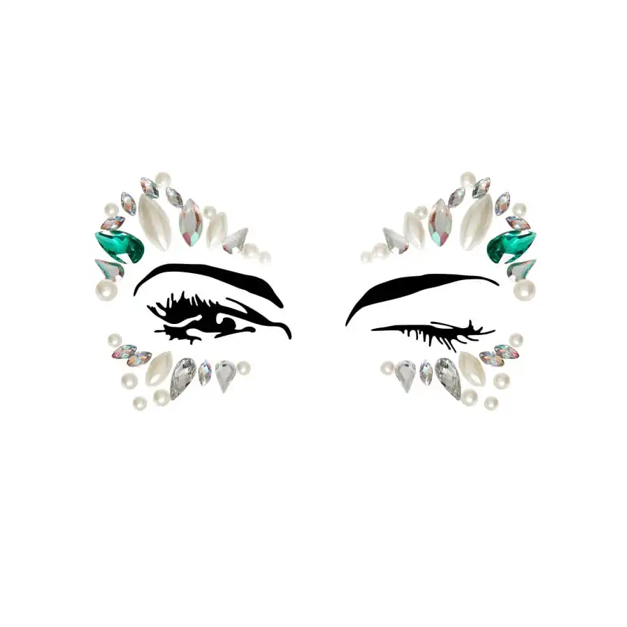 Ces bijoux sont fournis sur une planche et sont constitués de strass brillants dont certains évoquent l’aspect de perles ou de cristaux verts.