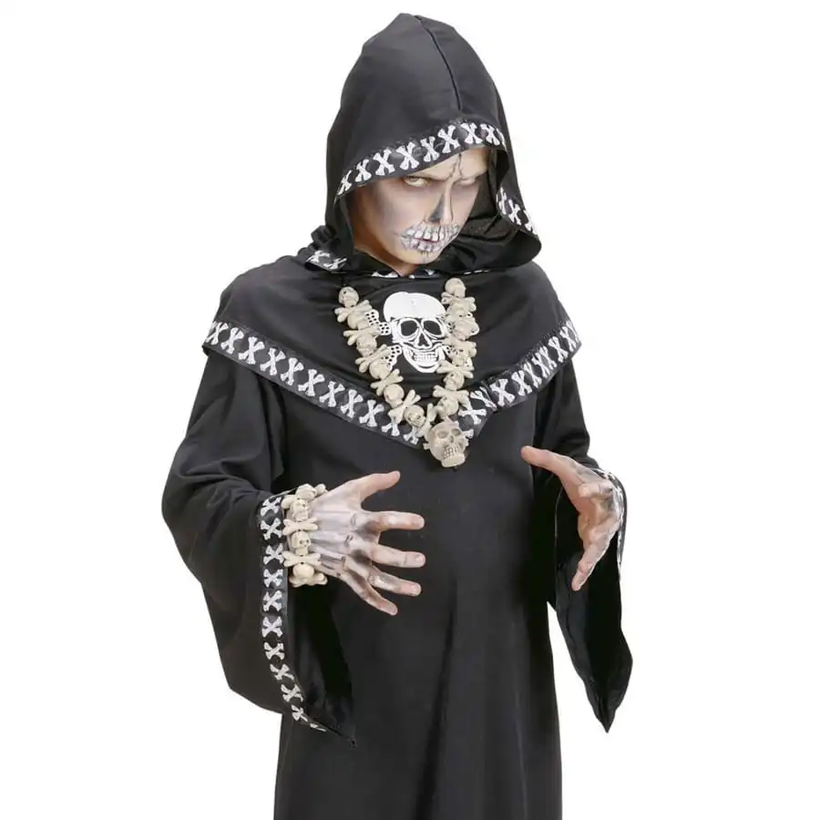 Bracelet noir composé de petites têtes de mort et d’os de couleur blanche, pour homme, femme, adolescent ou adolescente. Cet accessoire convient parfaitement à un thème de soirée gothique ou à une soirée d’Halloween.