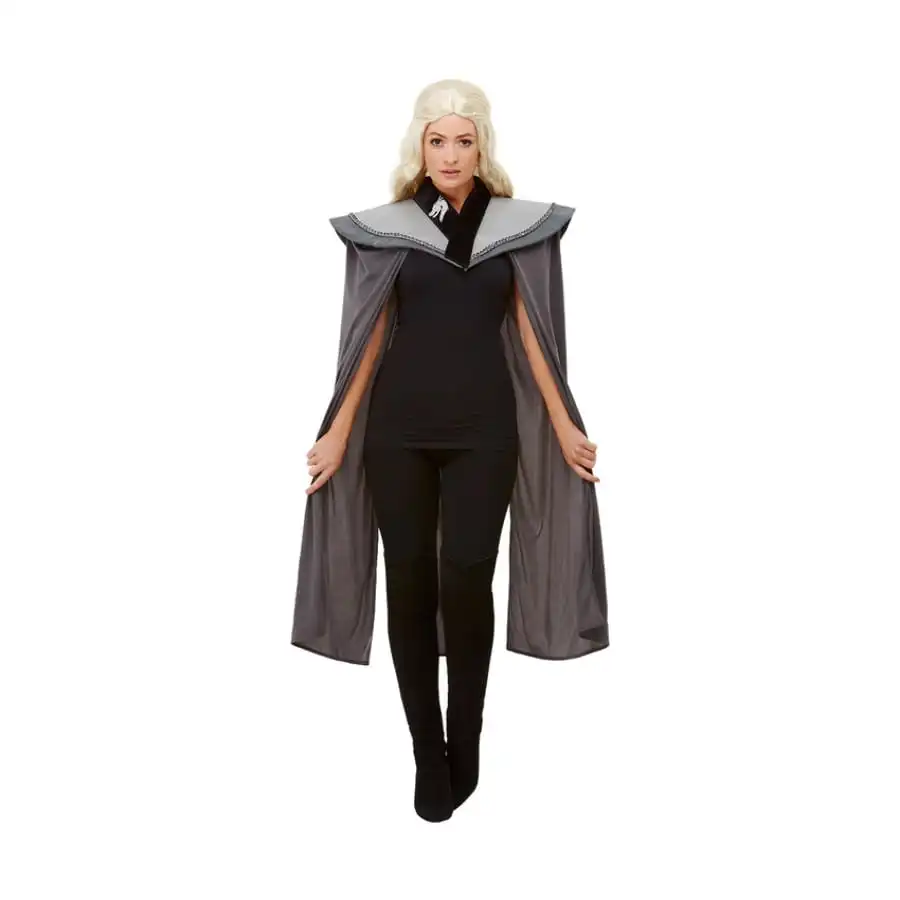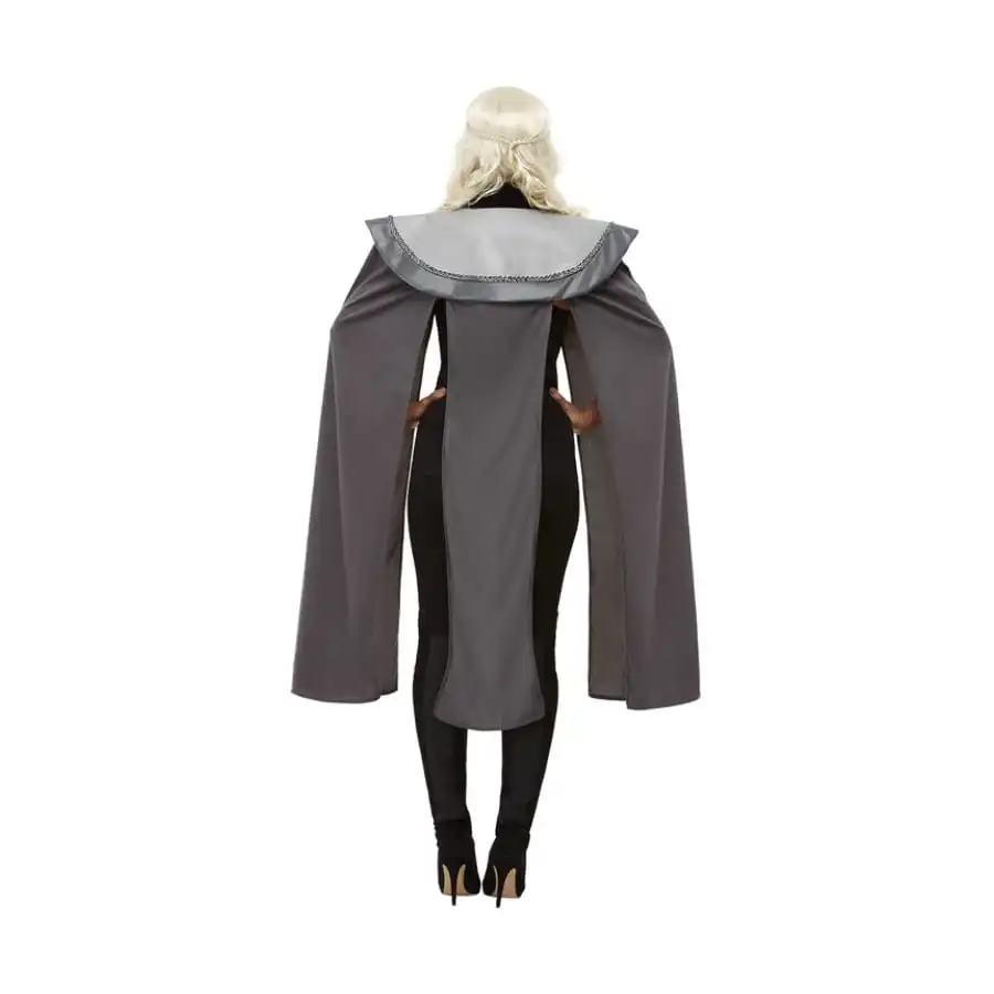 Rehaussez une tenue de chevalière du moyen-âge avec la cape médiévale grise avec larges épaules, femme.