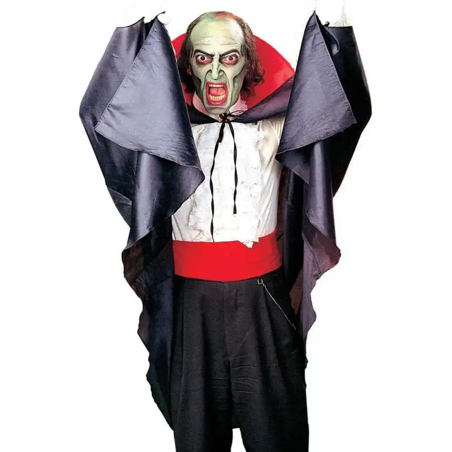 Cette cape noire de vampire présente un grand col rouge cousu sur l’arrière.