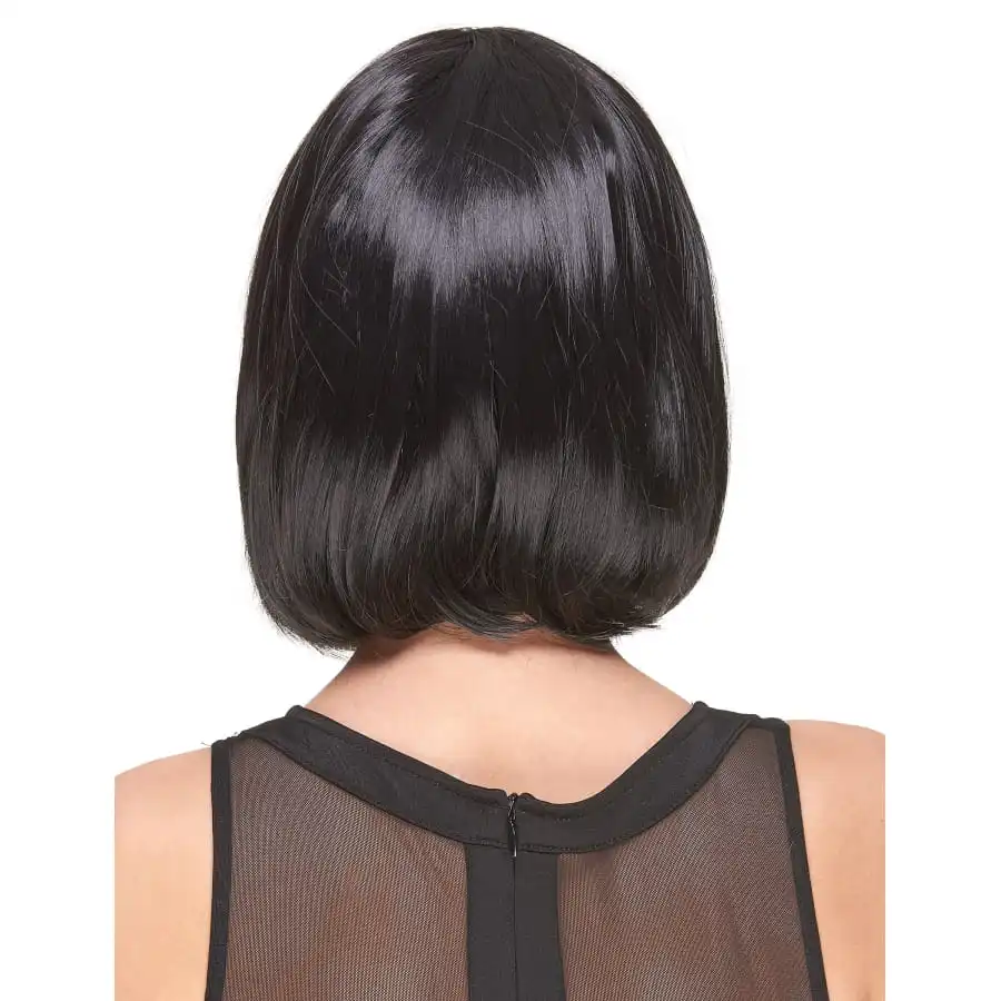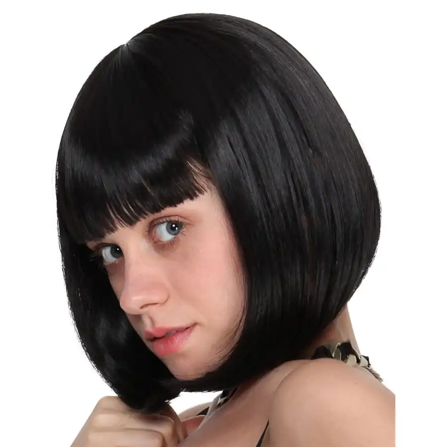 Si vous souhaitez frapper un grand coup lors d’une soirée années 20 avec une perruque qui apporte la petite touche moderne, ce carré plongeant noir avec frange, luxe est fait pour vous.