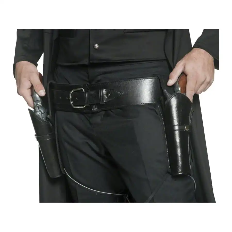 Ceinture Ă double holster noire. Cet accessoire authentique vous permettra d’incarner un shĂ©rif ou un bandit dans un univers Western.