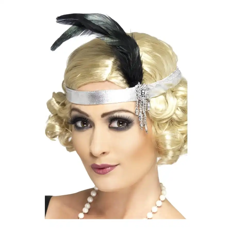 Simple tout en étant jolie cette coiffe Charleston argentée ornée de plumes noires. Cet accessoire est idéal pour compléter une tenue de danseuse de cabaret des années 20-30.
