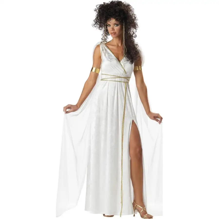 Cette Coiffe et robe blanche Athénienne pour femme est aussi chic que sexy grâce à sa longue fente qui laisse transparaître votre jambe jusqu’au niveau de la cuisse et son décolleté orné de galons dorés.