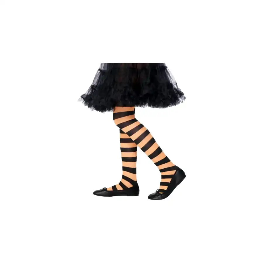 Paire de collants à rayures de couleur orange et noire. Cet accessoire est idéal pour un déguisement de sorcière pour Halloween.