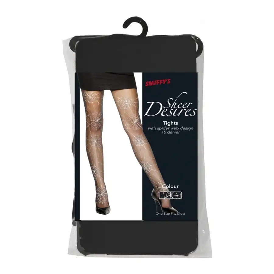 Paire de collants semi-transparents de couleur noire, pour femme, imprimée de toiles d’araignée de couleur blanche. Pour un déguisement de sorcière réussi pour Halloween, enfilez donc cette paire de collants!