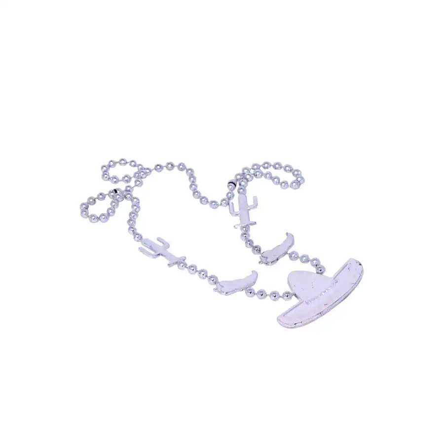 Il est constitué d’une kyrielle de perles argentées, accompagnée de divers pendentifs en forme de cactus, de piments et de sombrero, toujours de couleur argentée.