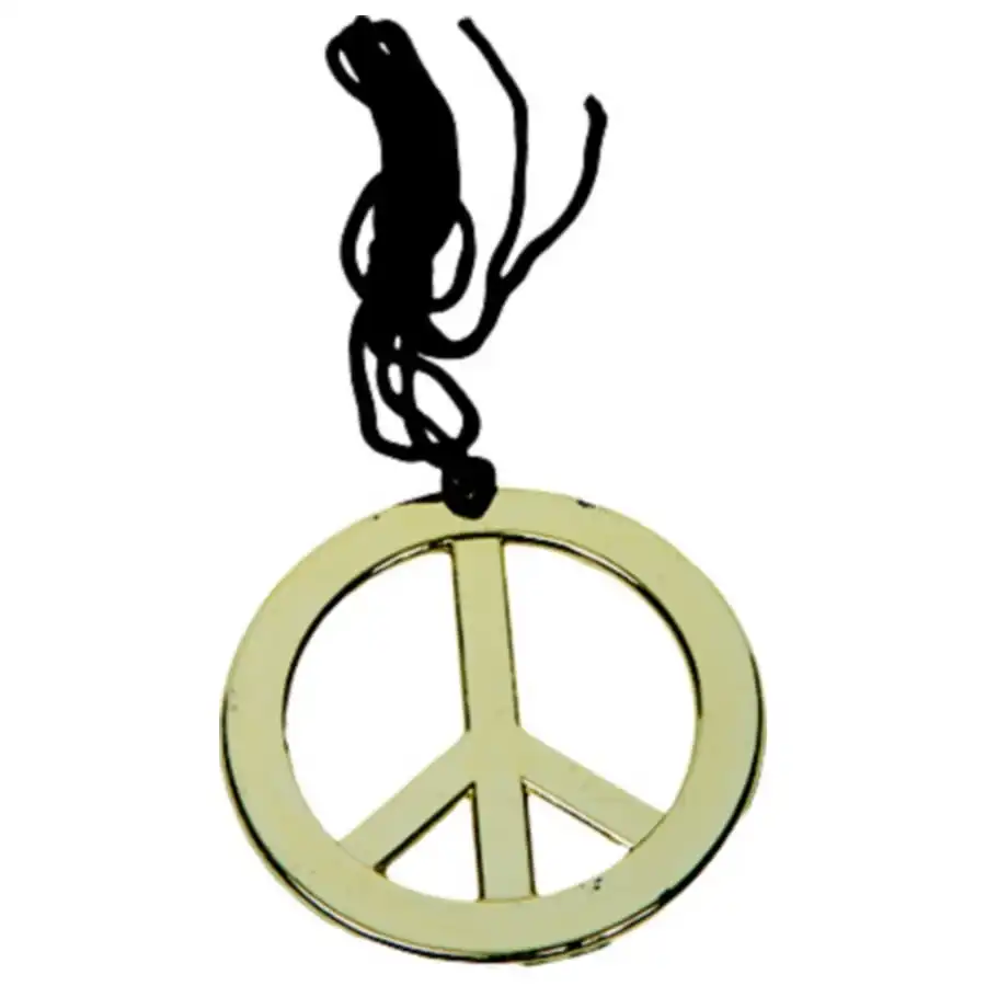 Prônez la non-violence et le mouvement hippie avec ce collier avec pendentif peace and love doré. Au bout de son cordon noir se trouve un pendentif doré arrondi avec le fameux symbole peace and love. Vous pourrez porter cet accessoire à une fête à thème Années 50-60, avec un vrai déguisement hippie, que vous pourrez choisir parmi la large collection Happyfete.