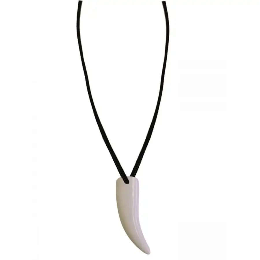 Le collier de Brice de Nice est constitué d’une fine corde noire et d’une fausse dent blanche de requin en guise de pendentif.