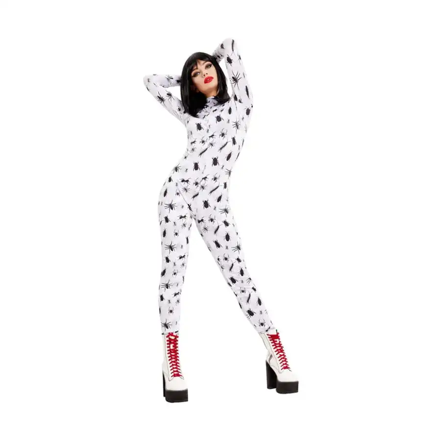 La combinaison blanche recouverte d’insectes pour femme est moulante.
