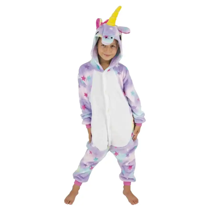 C’est une combinaison pour enfant en forme de licorne, taillée dans un tissu effet peluche.