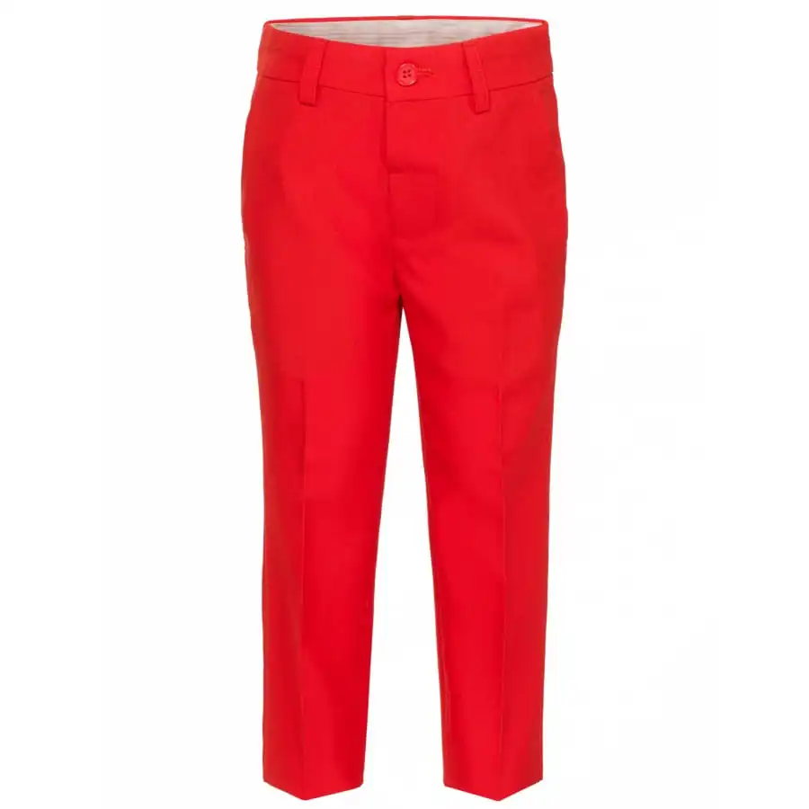 Le pantalon est rouge et se ferme à l’aide d’une fermeture éclair et d’un bouton.