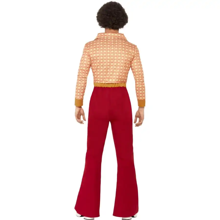 Réveillez le roi du disco qui sommeille en vous et retournez quelques années en arrière avec ce déguisement authentique des années 70. Oui, authentique, car il est bel et bien composé d’un haut à grande encolure pointue et à longues manches, bien moulant tout comme le pantalon qui va avec, se caractérisant par sa taille haute et ses pattes d’éléphant. Le haut est à motifs de couleur orange et le pantalon de couleur rouge avec des bordures orange bien colorés, pour que vous soyez à cent pourcent dans le style année 70. Les tailles disponibles sont : L, M et XL. Nous préconisons des chaussures avec de larges talons, une coupe afro et une moustache.