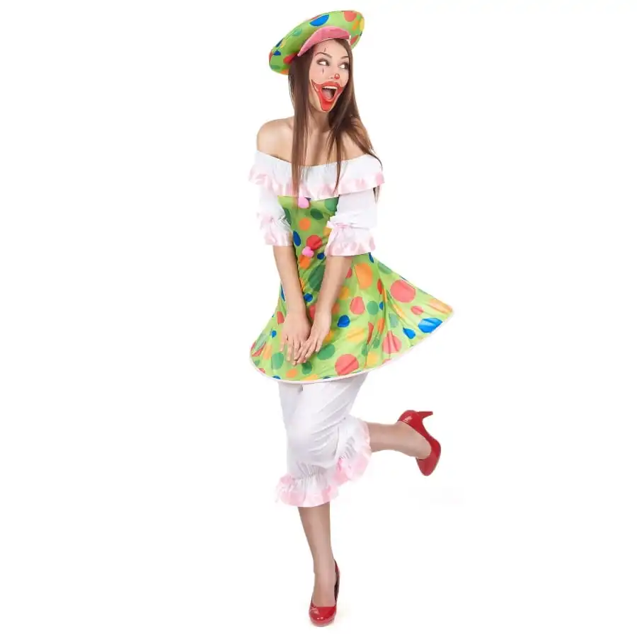 Pour le carnaval pourquoi ne pas vous déguiser en clown madame, vous serez rigolote. Ce costume en taille M , il est composé d’une robe avec cerceau vert et des ronds multicolores dessus et d’un panty blanc avec un ruban rose au bas. Il est aussi composé d’une casquette multicolore. Vous parfaite en clown pour une fête basée sur le thème du cirque.