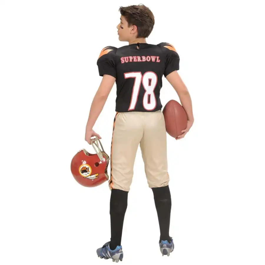 Autour du thème sport, nous vous proposons ce costume de footballeur américain pour enfant. Il est essentiellement composé d’un tee-shirt noir à manches courtes avec des rembourrages sur les épaules, il est marqué du numéro du joueur devant comme derrière. Le pantalon qui va avec est de couleur beige avec des bandes orange et noires sur les côtés. Long jusqu’au-dessous des genoux, il est maintenu par un élastique à la taille. Il est rembourré de façon à imiter les protèges-genoux. Il est conseillé de porter de longs faux bas pour plus de réalisme, avec les chaussures adaptées. Le casque, les chaussettes et chaussures ainsi que le ballon sur la photo ne sont pas inclus dans l’ensemble.