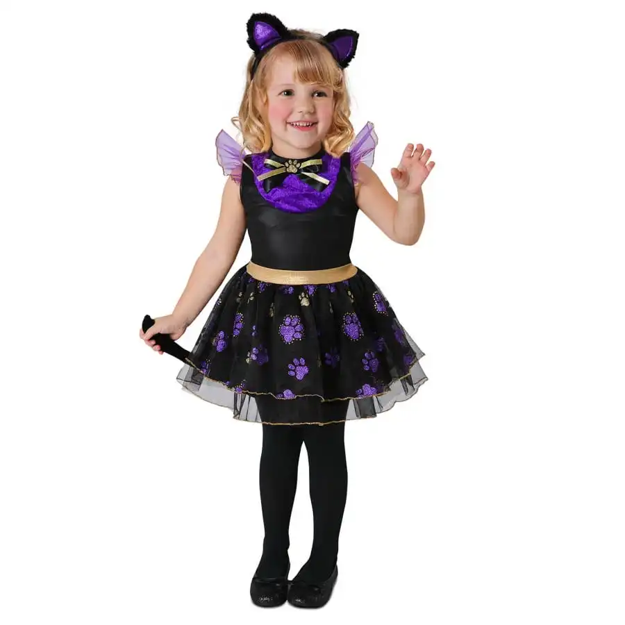La chasse aux bonbons commence sur des chapeaux de roues cette année, avec le costume de petit chat noir et violet pour bébé.