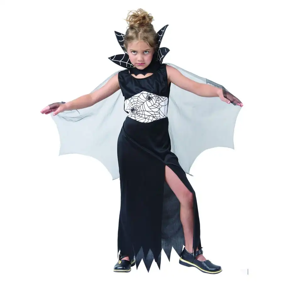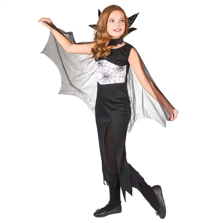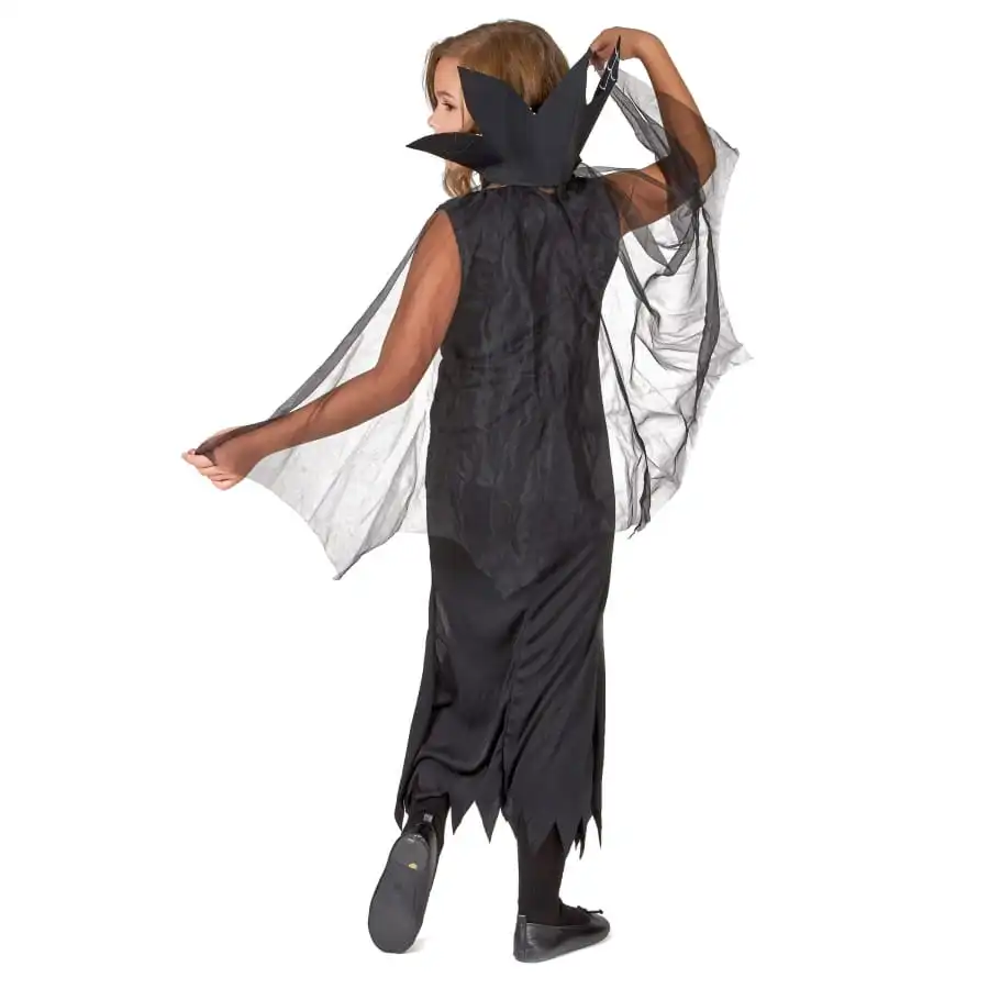 Le costume de petit sorcière araignée pour enfant est un déguisement taillé pour votre petite fille à l’occasion de la fête des morts. En effet, en enfilant cette tenue, elle se distinguera de par son originalité et de par sa créativité ! Cet article, disponible sur notre site se présente sous la forme d’une longue robe de couleur noire. Elle est pourvue d’une fente sur le côté gauche. Celle-ci arrive jusqu’en haut du genou. La robe, conçue dans un tissu satiné, se trouve décorée d’une matière blanche à motifs de toile d’araignée sur le devant. L’ensemble s’accompagne aussi d’une cape noire fait de fin voilage. Elle se prolonge en col montant en feutrine qui se ferme par scratch sous le menton.