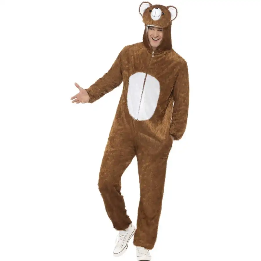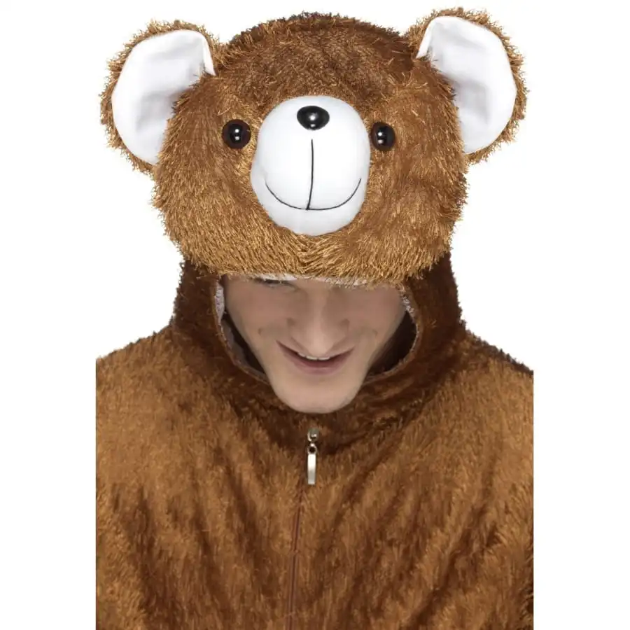 Déguisement d’animal, pour homme ou mascotte, composé d’une combinaison en peluche marron avec cagoule assortie intégrée. Cet ensemble est disponible en taille M. Il est idéal pour se transformer en gros ours tout mignon pour un carnaval ou un anniversaire.