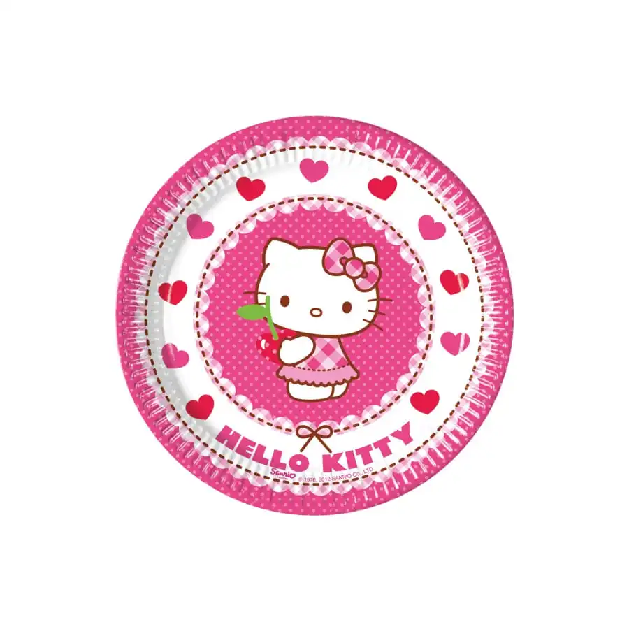 Peu importe votre choix, ces accessoires de décoration de table rose et blanc représentent merveilleusement le personnage Hello Kitty avec une cerise à la main et entouré de motifs coeur, frise, pois, vichy…