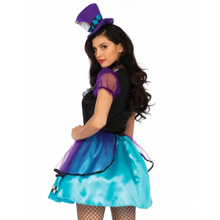 Il est composé d’une robe, d’un mini-chapeau coloris violet perché sur un serre-tête et d’un collier ras-le-cou.