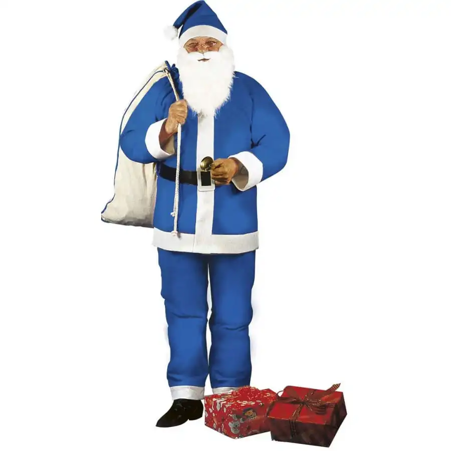 Le déguisement bleu de Père Noël pour homme est constitué de plusieurs pièces. Une veste bleue à longues manches aux extrémités blanches de même que le bas du haut. Le pantalon bleu quant à lui est ample et confortable. Cet ensemble est agrémenté d’une ceinture noire qui se porte sur le ventre. Le bonnet possède un tour de tête et un pompon blanc. Enfin,une barbe blanche volumineuse à moustache complète ce costume.