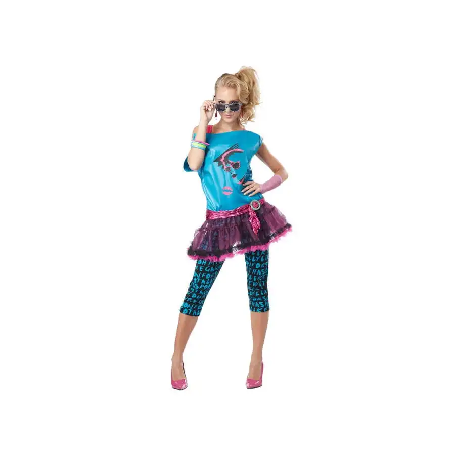 Si les années 80 vous manquent, vous pourrez réinventer cette époque en portant, pendant un carnaval ou une soirée costumée, ce déguisement bleu imprimé années 80 pour femme.