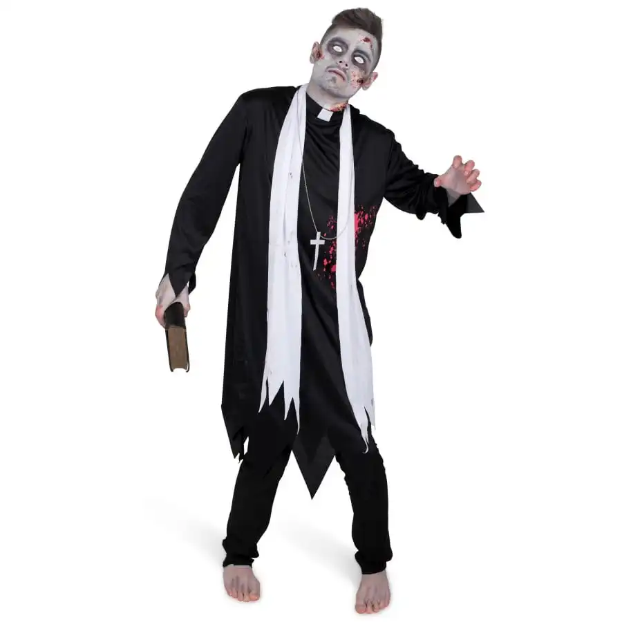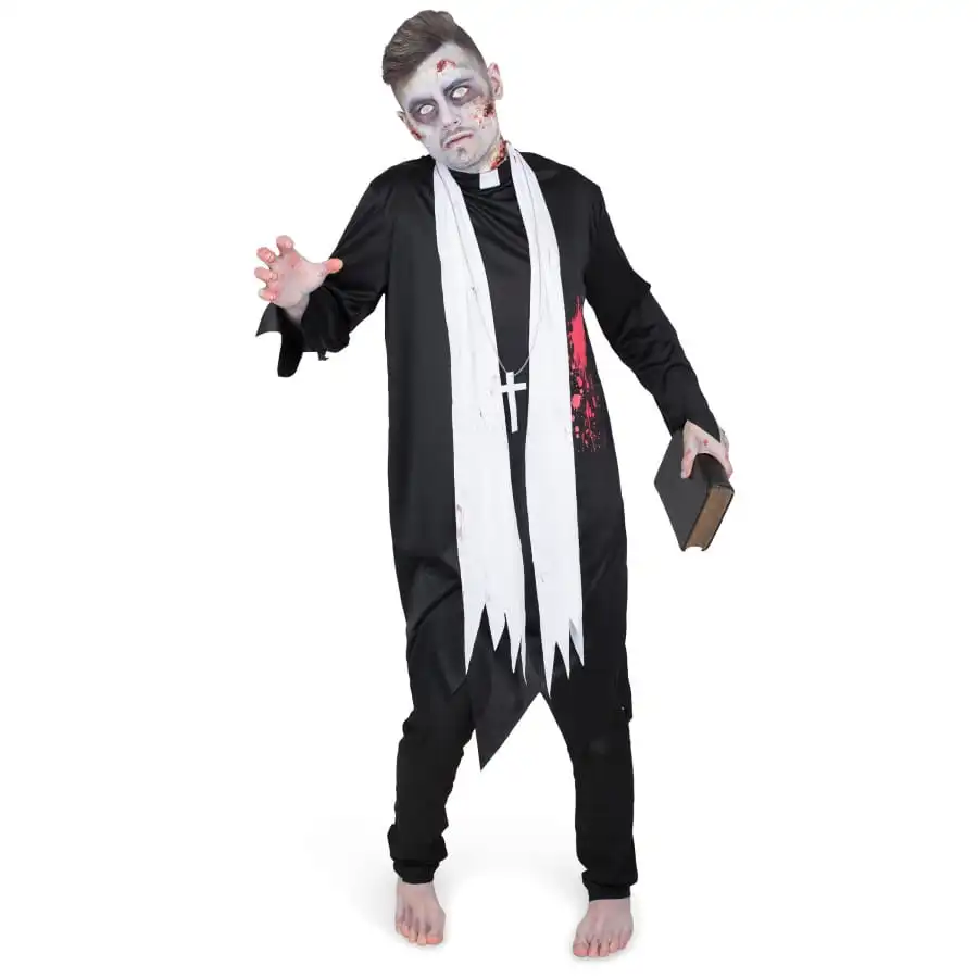 C’est une idée originale qui prend vie grâce à ce déguisement de curé mort vivant.