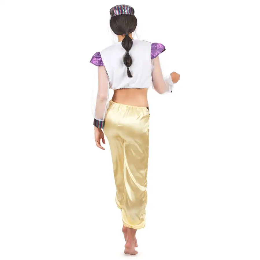Les danseuses orientales attirent les regards dans leurs tenues qui font rêver. Lancez-vous dans la danse du ventre en commandant ce magnifique déguisement de danseuse orientale violet et blanc. Vous porterez un petit haut blanc qui laisse le ventre à l’air. Un faux gilet à manches courtes a été cousu par devant. Il est de couleur violet agrémenté de liserés dorés. Les manches du haut sont en voile blanc transparent, avec des extrémités à rayures multicolores. Le pantalon qui va avec la tenue est de couleur or et bronze, orné de quelques rayures colorées sur le devant. La coiffe présente également différentes bandes de couleurs en rayures verticales, agrémentées d’un léger voile blanc transparent.