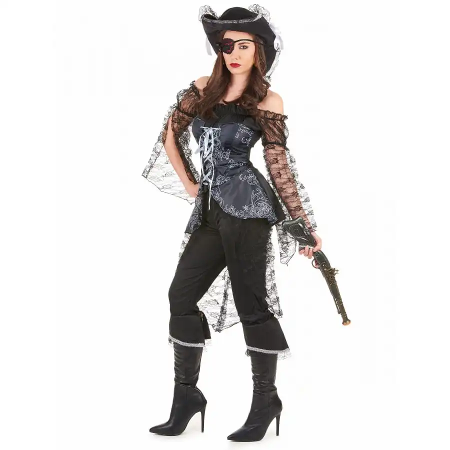 Mesdames, pour un costume de pirate réussi à l’occasion de la fête des morts, misez sur une tenue originale. Pour ce faire, nous vous proposons le déguisement de piratesse, manches en dentelle. Ce produit reste disponible sur notre site. Il se compose d’un haut noir à épaules dénudées. Ses manches longues et évasées sont faites en fine dentelle noire. Un petit gilet gris et noir à corsage blanc s’ajoute à ce haut. Pour le bas, vous aurez droit à un pantacourt noir pourvu d’un élastique à la taille. Il offre ainsi plus de confort. Une paire de couvres-bottes noires vient avec l’ensemble et un chapeau assorti le complète. Sur leurs bords respectifs se trouve un ornement couleur argent.