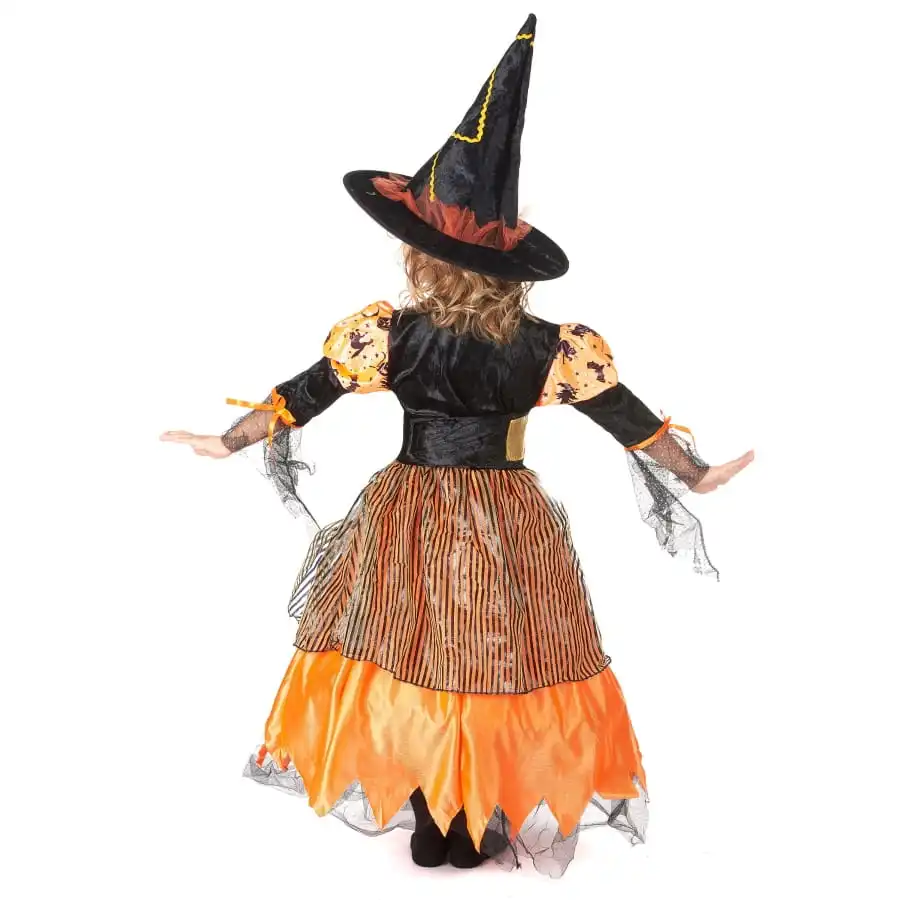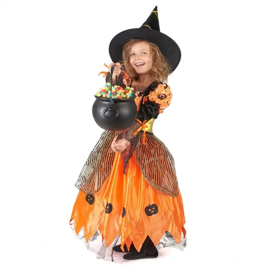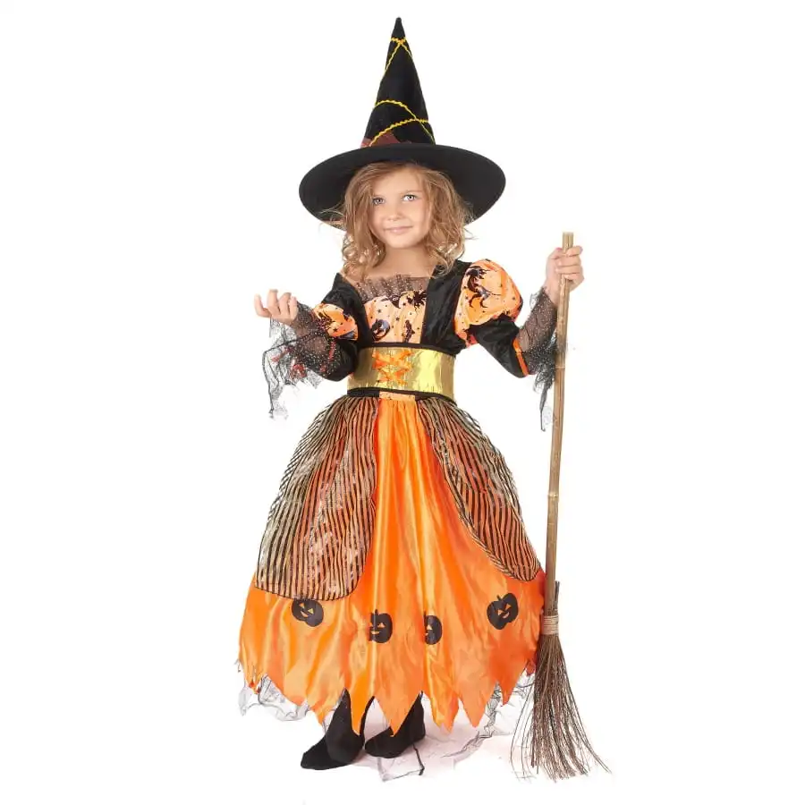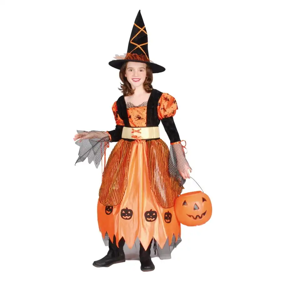 Mesdames, si votre fille aspire à se déguiser en une adorable petite sorcière pour la fête des morts, nous avons le costume que vous recherchez. Il s’agit du déguisement de sorcière citrouille pour fillette que vous retrouverez sur notre site. Il se compose d’une robe bouffante orange conçue dans une matière satinée. Au niveau des manches, des voiles à pois déchiquetés recouvrent les mains. Au-dessus de la jupe se superpose un voile noir à rayures, ouvert sur le devant. La jupe présente également des motifs à têtes de citrouilles noires. Quant à la ceinture de la robe, elle est dorée et possède un faux laçage sur le devant. Elle donne encore plus de volume à la jupe. A l’ensemble s’ajoute un chapeau noir de sorcière, avec de faux laçages orange.