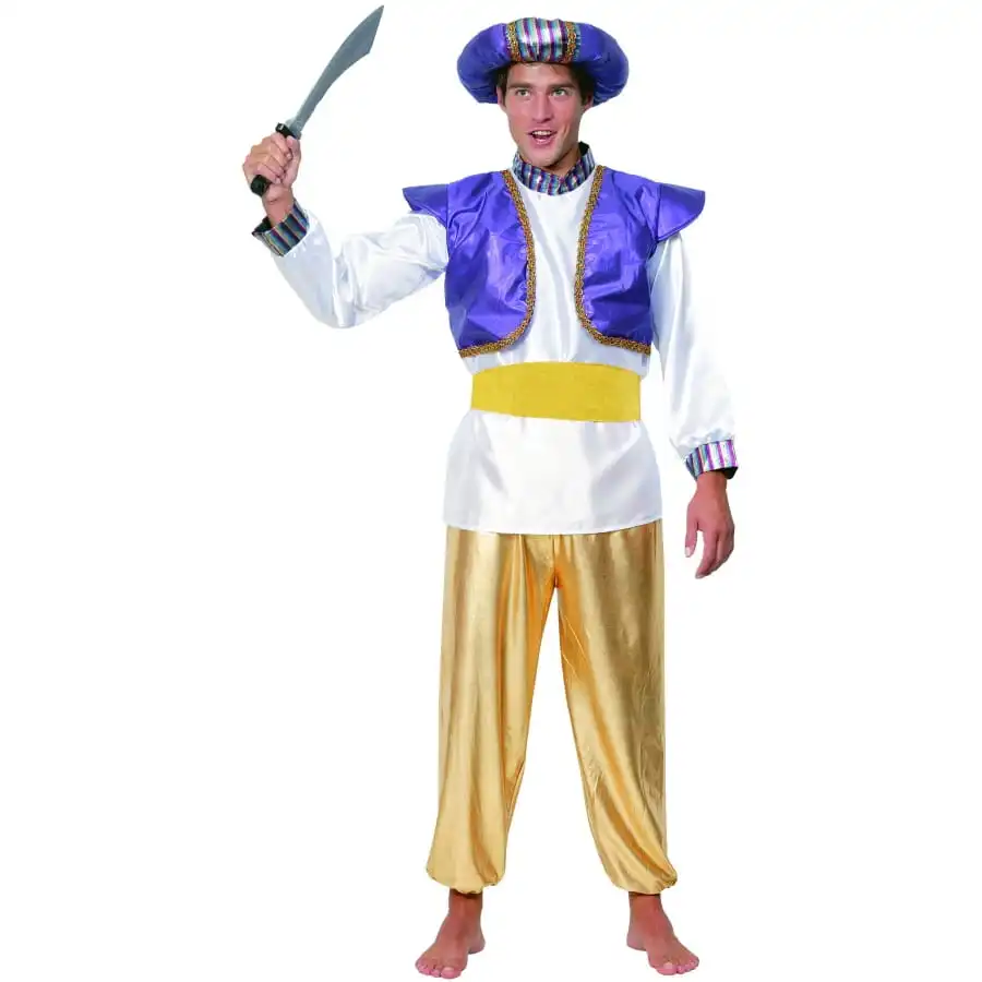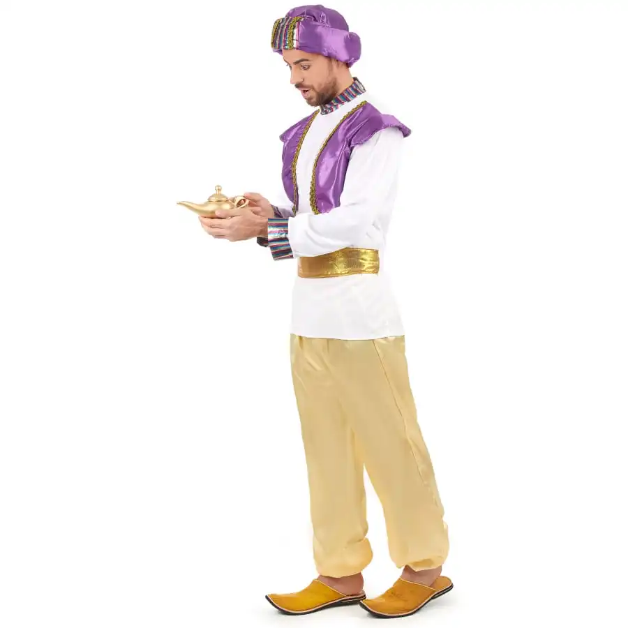 Un grand palais, des serviteurs, une garde-robe somptueuse et bien d’autres privilèges encore, goûtez à la merveilleuse vie d’un sultan ! Pour ce faire, munissez-vous du déguisement de sultan violet, blanc et doré. Il comporte un haut à manches longues, avec faux gilet intégré. Le haut est de couleur blanche avec le bout des manches et le col ornés de tissu à bandes multicolores brillantes. Le faux gilet a été conçu dans un tissu satiné violet avec liseré doré. Il comprend également un pantalon jaune clair satiné, imitation sarouel, avec taille élastique. Une large ceinture en tissu doré vient marquer la taille. Elle se noue tout simplement dans le dos. Pour finir, le couvre-chef de sultan est en tissu violet rembourré de mousse. Le modèle est compatible aux tours de tête d’environ 56 cm.