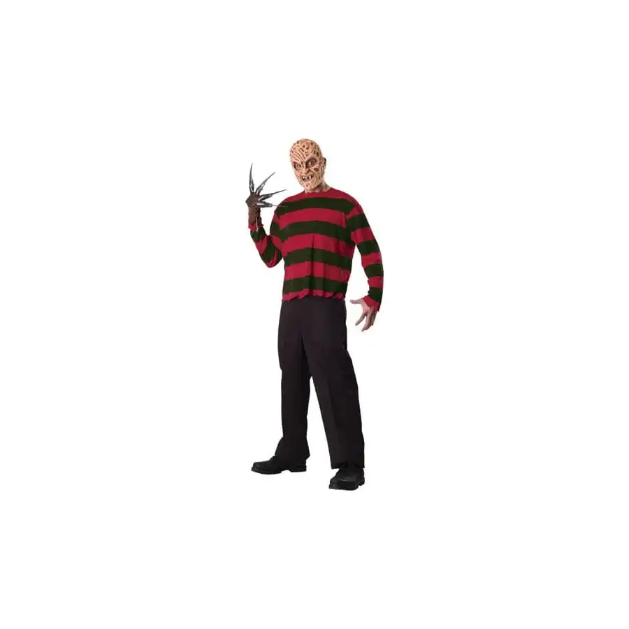 Déguisement de Freddy Kruger sous licence, pour homme, composé d’un affreux masque en mousse rouge et beige, d’un T-shirt à rayures rouges et noires et d’un gant avec griffe. Faites revivre à vos amis et ennemis leurs pires cauchemars.