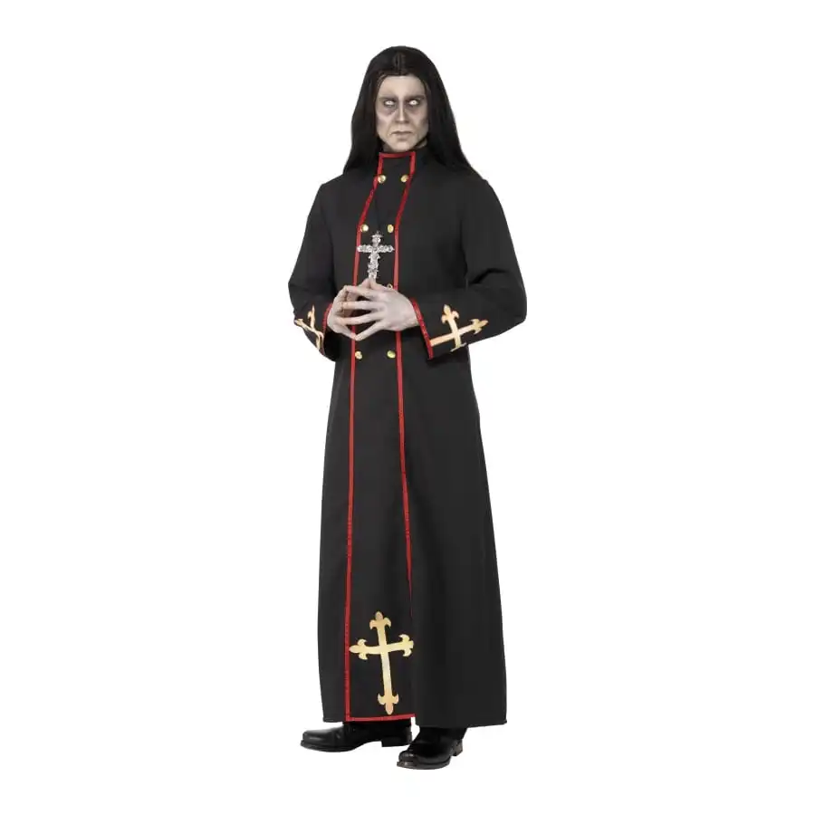 Déguisement de Ministre de la Mort, pour homme, composé d’une longue robe noire et rouge avec croix argentées. Incarnez un personnage gothique et religieux à l’occasion d’Halloween.