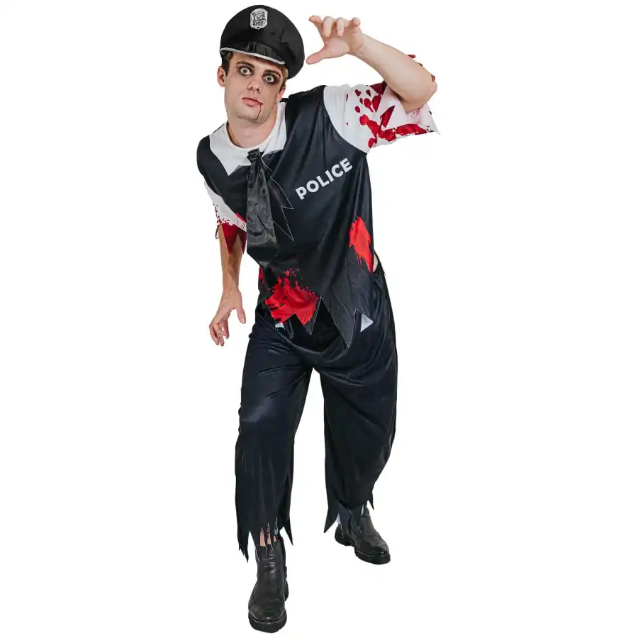 Déguisement de policier zombie, pour homme, composé d’un top et d’une cravate noirs avec fausse chemise blanche, d’un pantalon noir et d’un képi assorti. L’ensemble est disponible en taille S, M ou L. Il est entièrement ensanglanté. Associé au bon maquillage, vous serez un zombie parfaitement crédible.