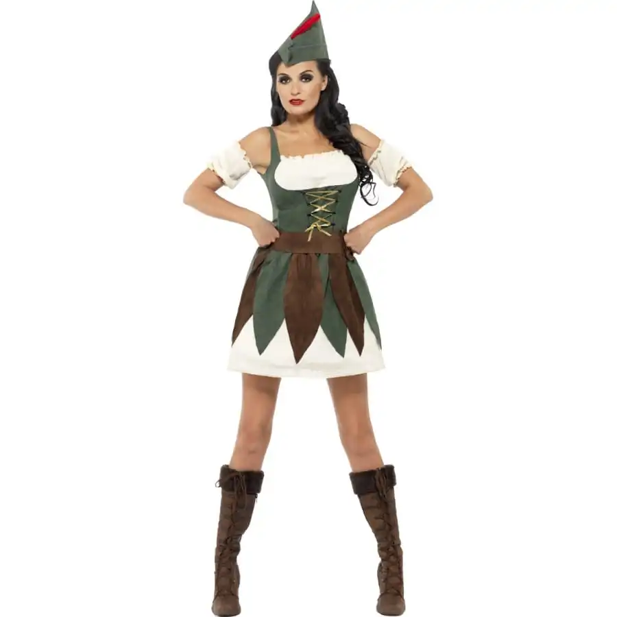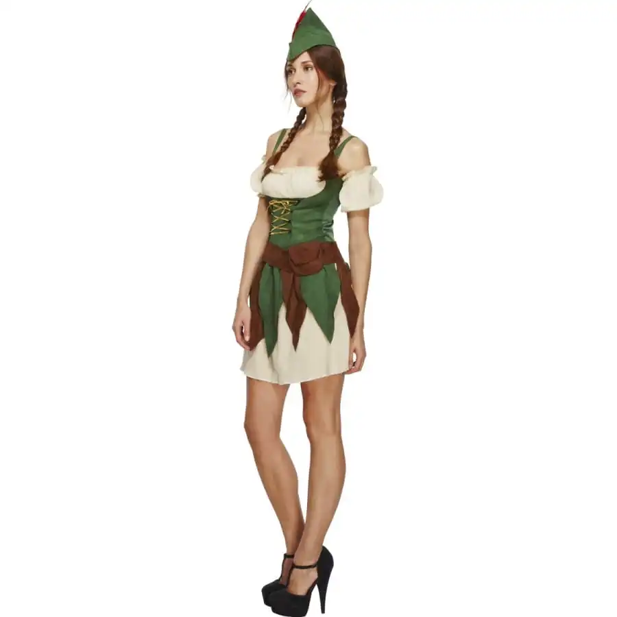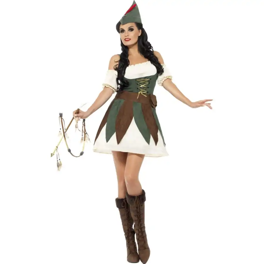 Déguisement de hors-la-loi sexy, pour femme, composé d’une robe, de manches, d’un chapeau et d’une ceinture. Les couleurs de l’emsemble incluent le beige, le verte, le marron, le doré et le rouge pour la plume sur le chapeau. Devenez un Robin des Bois féminin et plus sexy!