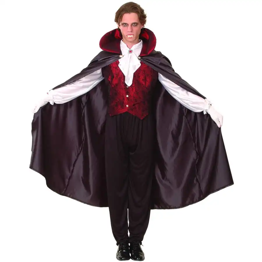 Le déguisement vampire avec cape pour homme reste un des incontournables costumes pour accueillir la fête des morts. Il se compose d’un pantalon noir à élastique, afin de mieux s’ajuster à votre taille. La tenue compte aussi une cape noire conçue dans un tissu satiné. Elle se trouve pourvue d’un col montant bordeaux. Le haut du costume est constitué d’une chemise blanche et d’un gilet bordeaux rattaché. Le gilet a été taillé dans un tissu satiné à motifs noirs. Si vous voulez que votre costume soit encore plus réaliste, nous vous invitons à y ajouter des dents de vampire et de vous maquiller avec la cosmétique adaptée. De tels articles restent disponibles sur notre site.