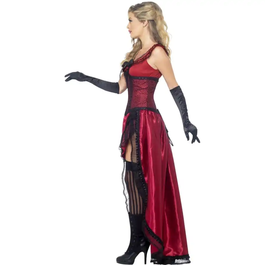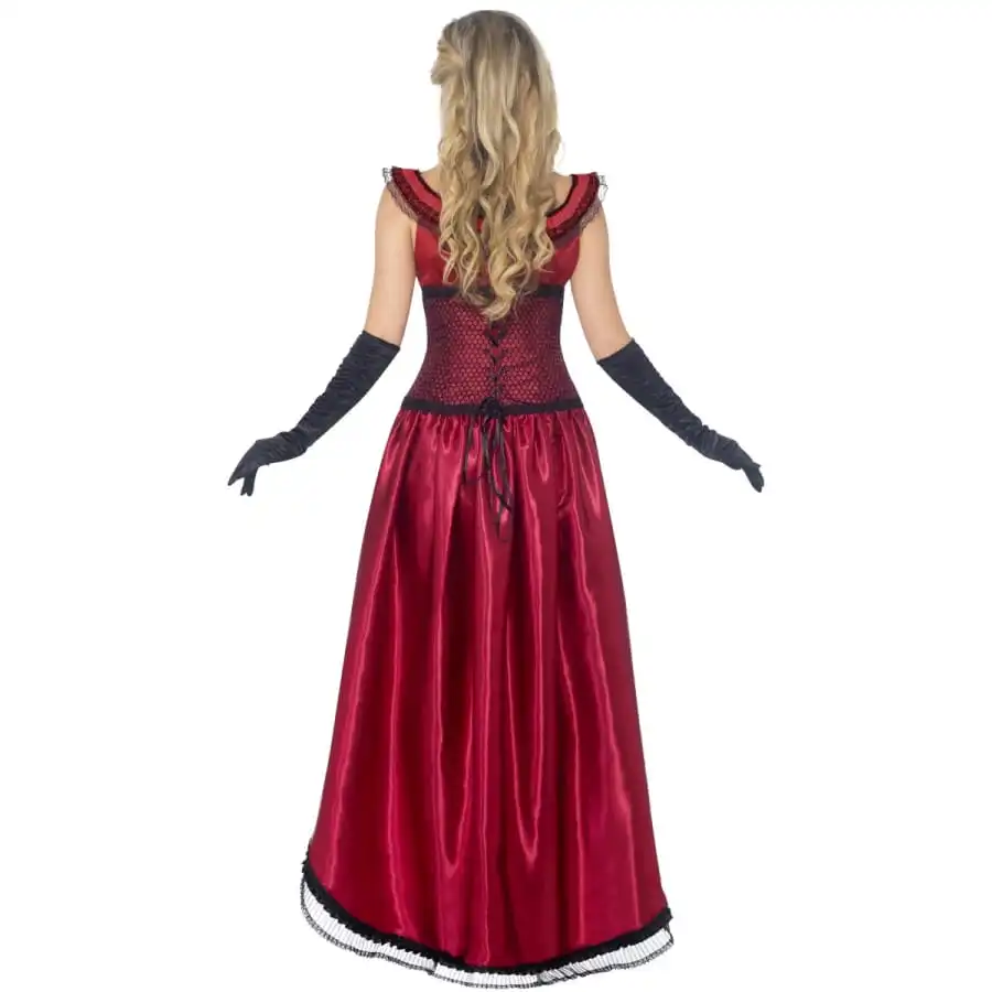 Déguisement Western, pour femme, composé d’une magnifique robe rouge et noire et d’un corset assorti. Le jupon de la robe est court devant et long à l’arrière. e tout est orné de volants, de dentelles et d’un unique noeud. Ajoutez-y des gants et des bas et vous voilà femme de saloon typiquement Western. Vous pourrez choisir la taille de la tenue lors de la commande, entre un S, M ou L.