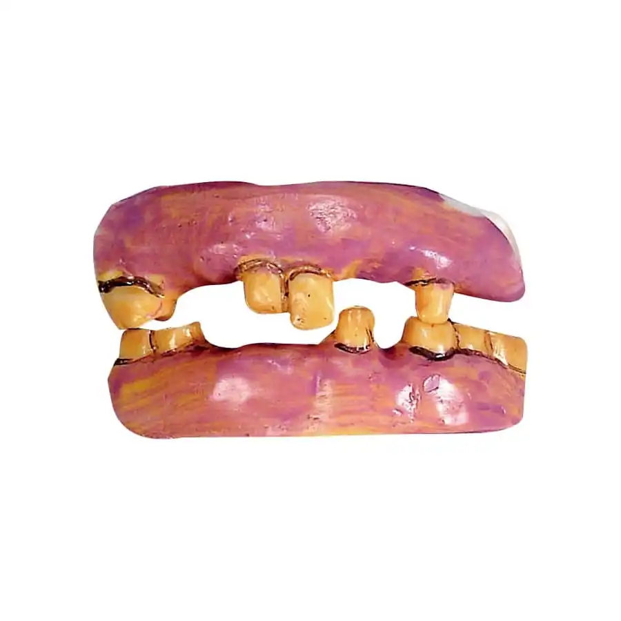 L’accessoire représente une dentition incomplète, avec de fausses dents usée et jaunes.