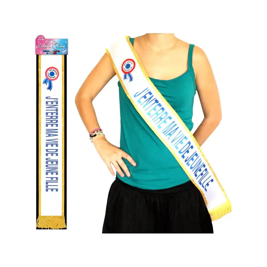 Plus que quelques temps et vous vous direz oui pour la vie ! Mais avant de passer cette étape, préparez avec soin votre enterrement de vie de célibataire. Vous serez la vedette de la soirée en portant cette écharpe j’enterre ma vie de jeune fille. Formée par un tissu blanc avec des liserés dorés, l’écharpe est parée de l’inscription “j’enterre ma vie de jeune fille” imprimée en bleu pailleté. Elle fait en tout une longueur de 184 cm.