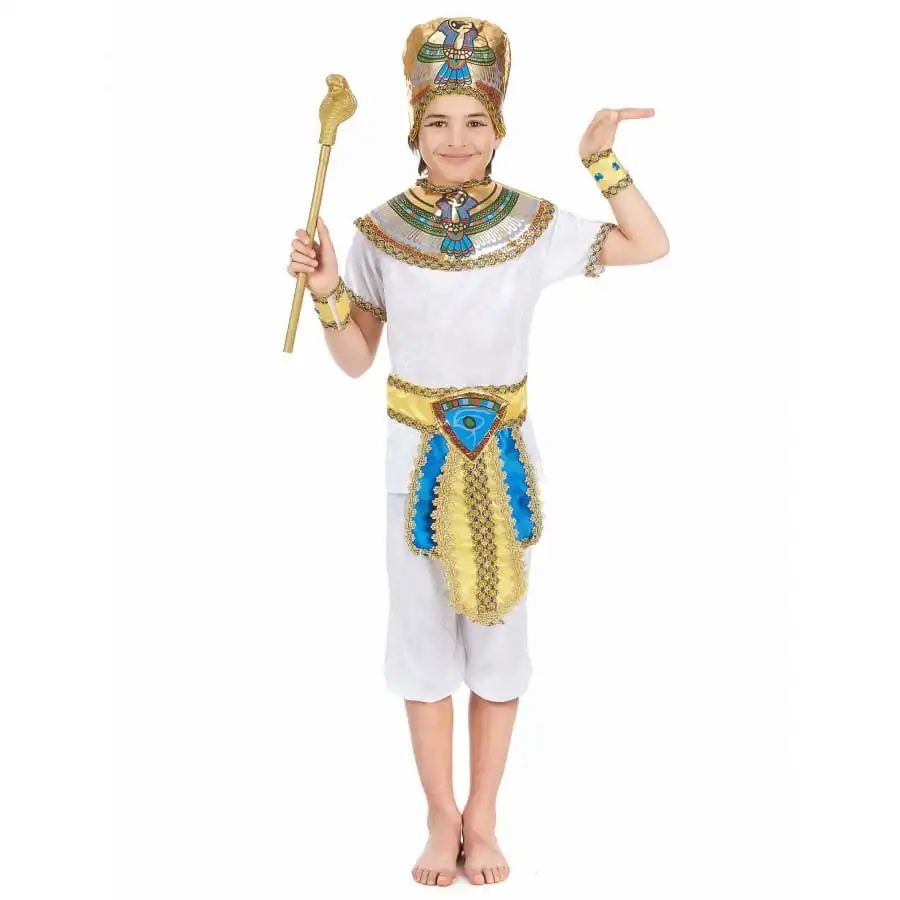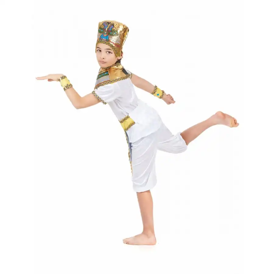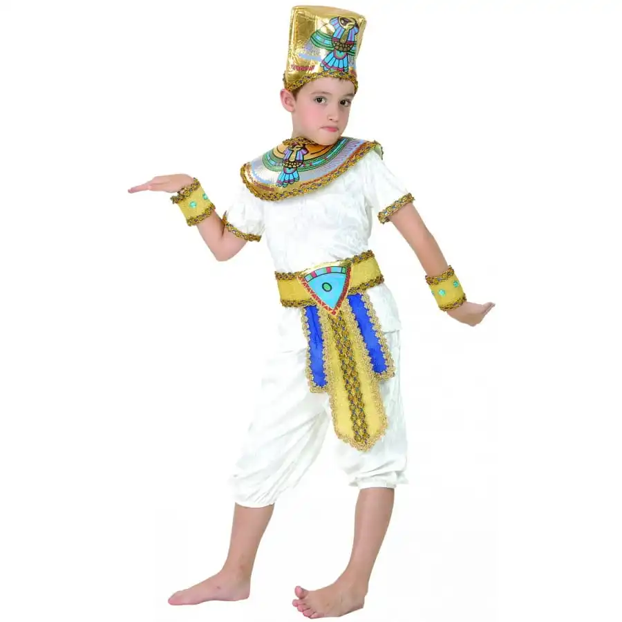 Pour une fête de l’école sur l’histoire de l’Egypte, offrez cet ensemble de petit égyptien pour garçon à votre bambin. Il est constitué d’un T-shirt et d’un pantacourt blanc en velours léger, le T-shirt étant bordé de liseré doré et bleu sur les manches. Le pantacourt est muni d’un élastique à la taille et sur le bas, ce qui l’adaptera à la morphologie de votre enfant. Un faux col doré et imprimé de dessins égyptiens vient se poser sur le haut, et une grande ceinture en satin doré avec sa bande tombante bleue et dorée au milieu se noue à la taille par un scratch. La coiffe imitation Némès est faite de tissu doré assorti au faux col ; elle rend la tenue authentique avec la paire de manchons dorés à scratchs, ornés de fausses pierres précieuses bleues. La ceinture, la coiffe et les manchons sont tous bordés de liseré doré et bleu.