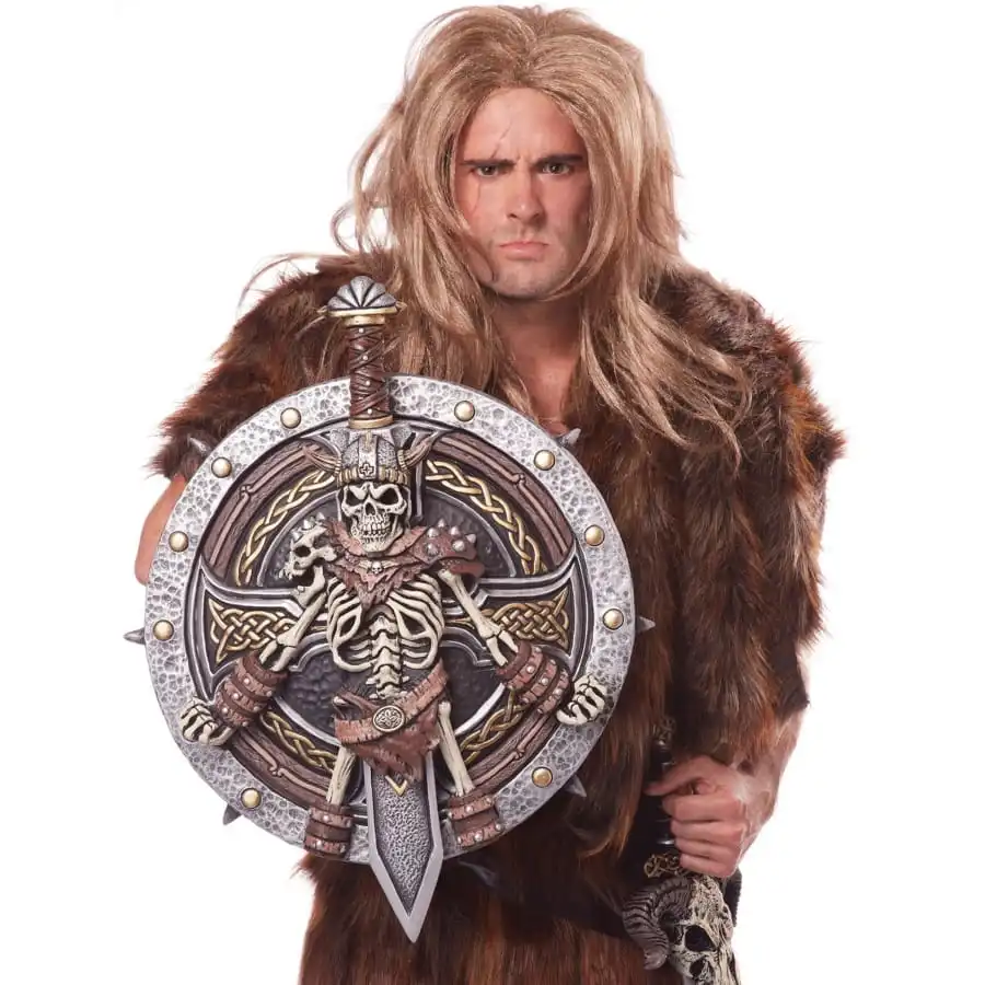 Ce superbe set d’accessoire épée et bouclier squelette de viking vous attend avec impatience dans notre site pour vous aider à animer votre fête. L’ensemble est de couleur marron et argentée. Le bouclier mesure 45,7 cm de diamètre, il est muni de piques argentés sur les bordures. L’épée est tenue au centre de ce bouclier par un squelette plus vrai que nature vêtu d’un costume de viking. Ces accessoires sont conçus pour hommes et petits garçons, ce sont des armes factices qui ne pourront causer aucun danger. Vous avez maintenant de quoi compléter votre costume de Viking à l’occasion de la prochaine fête déguisée ou pour la prochaine Halloween.