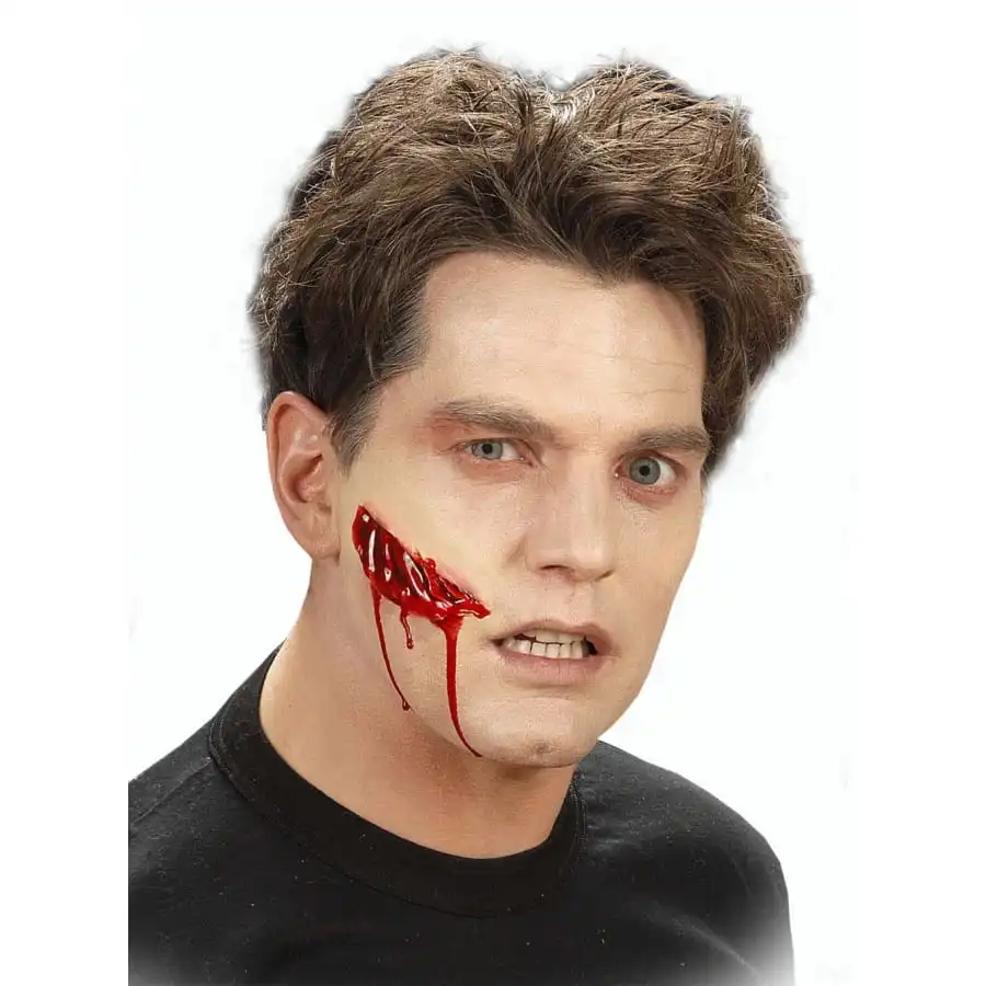 Le kit se compose d’une fausse plaie béante de 8,5 cm de long accompagnée de 2 sachets de colle d’une contenance de 1,5 ml.