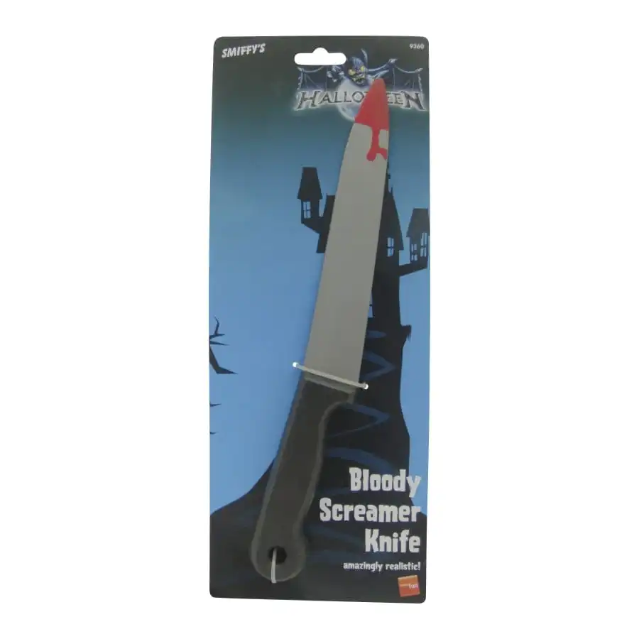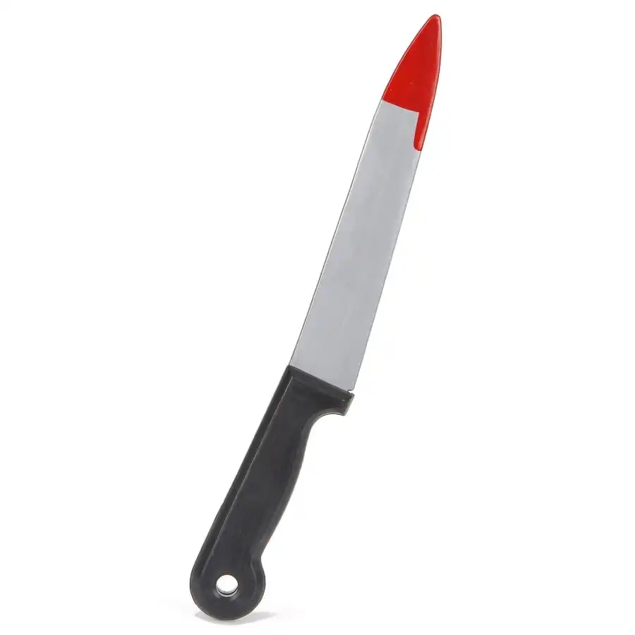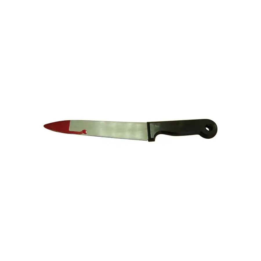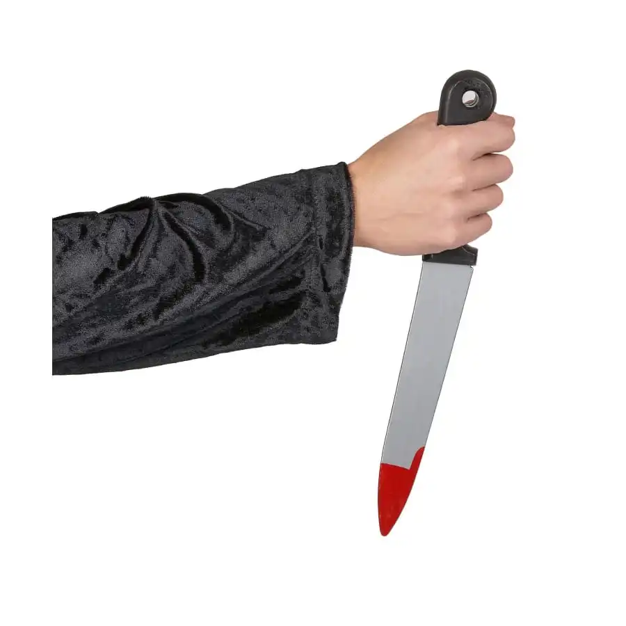 Grand couteau ensanglanté de couleur noire, argentée et rouge, en plastique. Cet accessoire pour homme mesure 35 centimètres de long. Il vous permettra de compléter avec succès un déguisement de tueur, de fou ou autre personnage criminel à l’occasion d’Halloween.