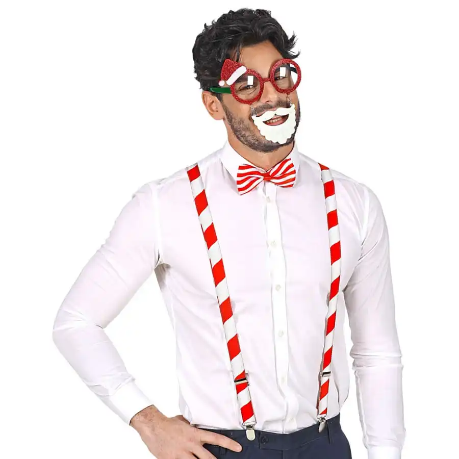 Le noeud papillon présente les mêmes couleurs que les bretelles (le rouge et le blanc) ainsi que le même motif ligné.