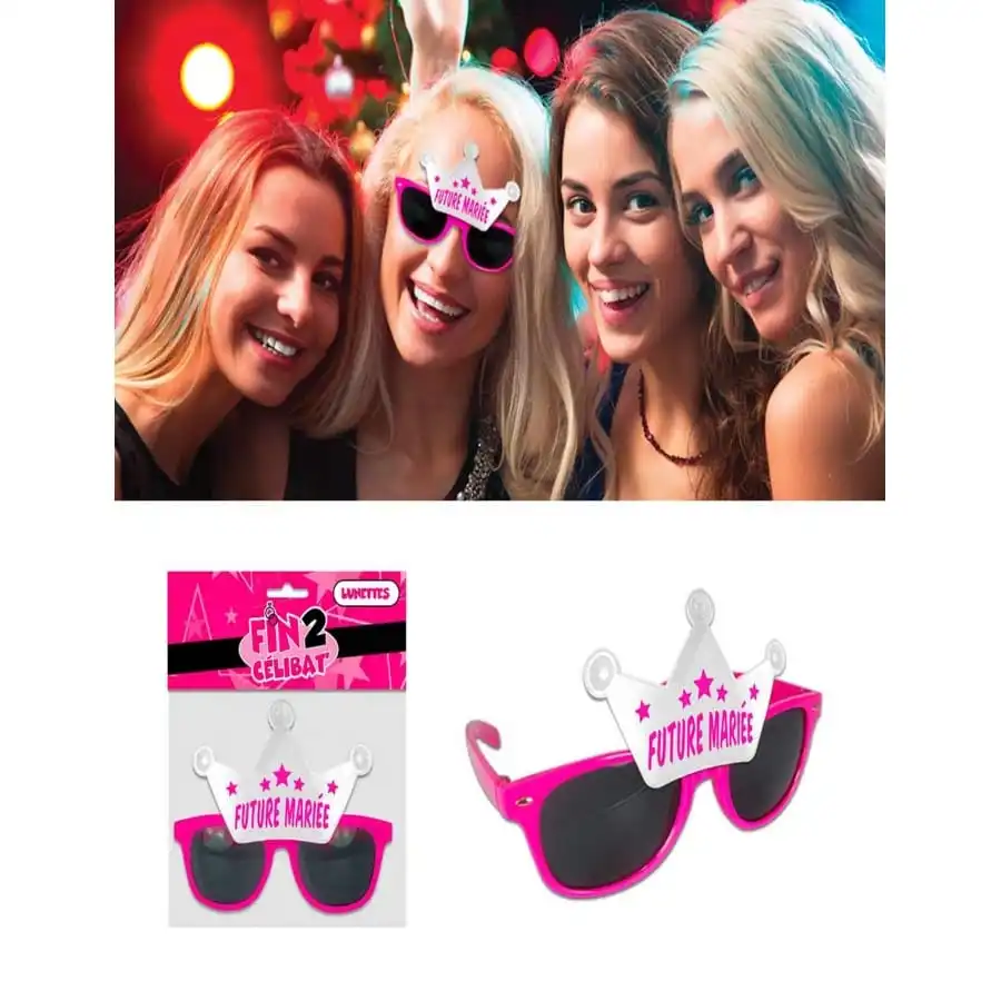 Une paire de lunettes rose aux verres de couleur noire et d’une couronne blanche ayant le message “future mariée” inscrit sur celle-ci.