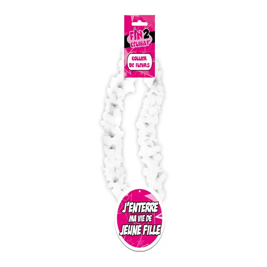 Un collier à fleurs muni de l’inscription “J’enterre ma vie de jeune fille”