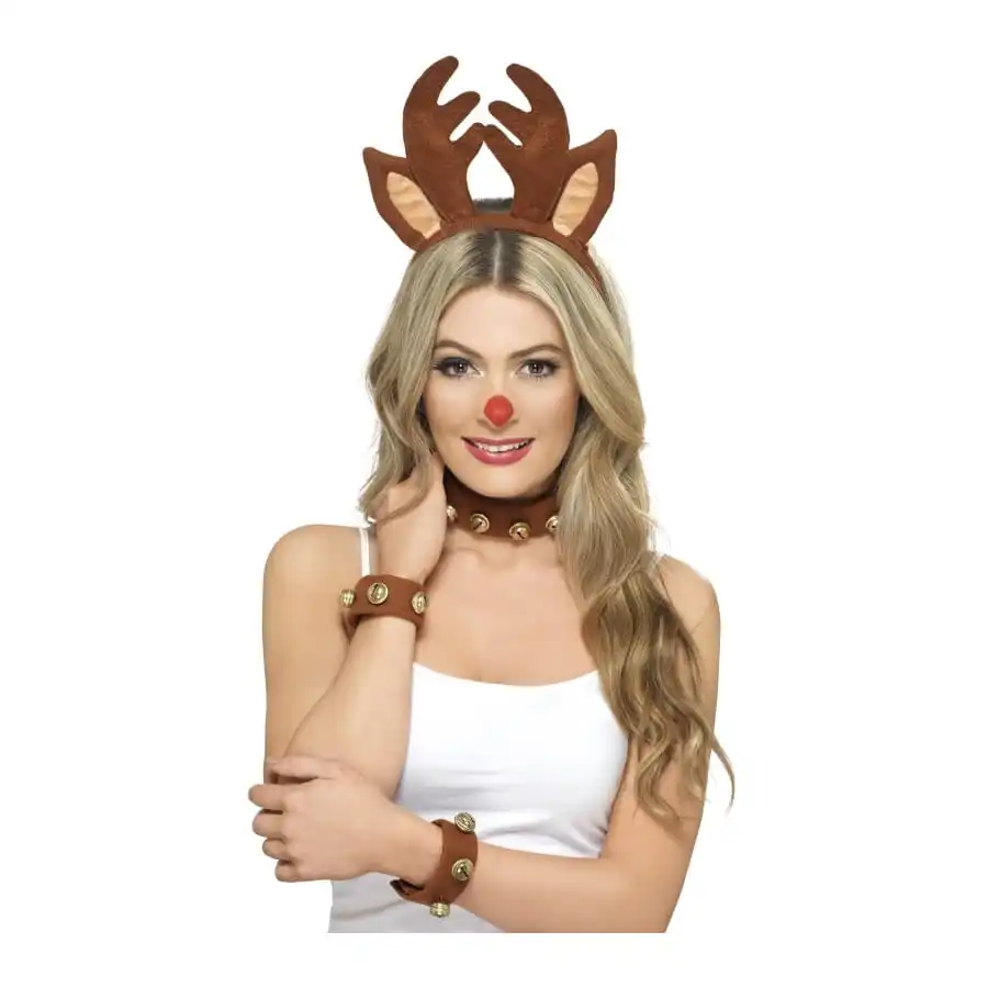 Transformez vous en renne avec ce kit de couleur marron. Le kit est composé de deux bracelets sur lesquels de petites cloches sont fixées, un collier marron comportant également des cloches et un serre-tête imitant les oreilles et cornes d’un renne.